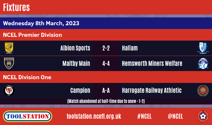 Despite freezing temperatures on Tuesday and snow on Wednesday night, all but one of the midweek Toolstation NCEL matches were completed.The only disappointment came in the top two clash in Division One where