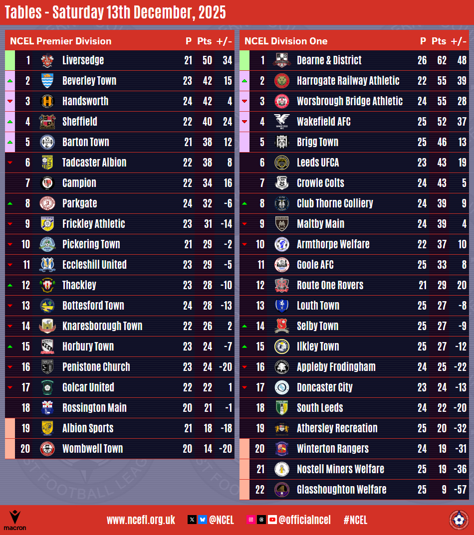 Liversedge and Dearne & District have strengthened their grip on pole position in the Macron NCEL Premier Division and Division One, respectively, after victories whilst their closest rivals dropped points on Saturday.Sedge opened up an eight-point gap at the summit after they were 2-0 winners at basement side