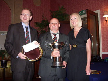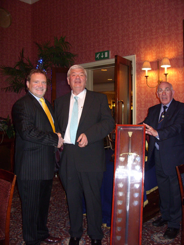 League Secretary Brian Gould helps Management Board member, Bruce Bickerdike, hand over the Wilkinson Sword Trophy to Staveley Miners Welfare Chairman, Terry Damms.