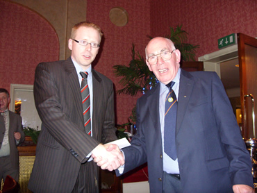 Chairman Simon Cope gets the runners-up cheque for the Presidents Cup for Scarborough Athletic from League Secretary, Brian Gould.