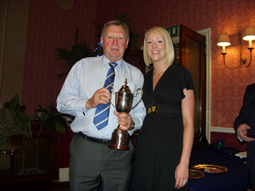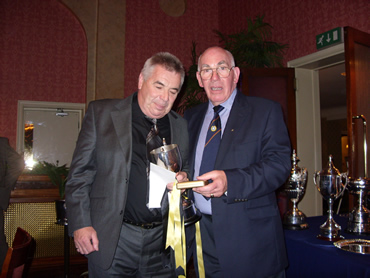 Nostell Miners Welfare's Roy Winfield is given the Presidents Cup trophy by League Secretary, Brian Gould.