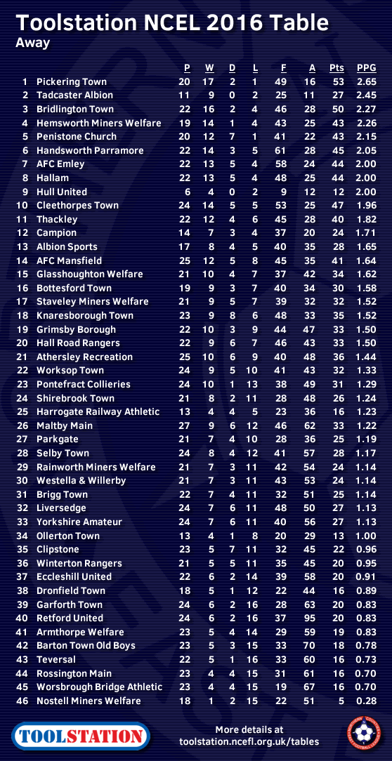 And, with an average of 2.65, Pickering Town were the best team on their travels with Tadcaster Albion second on 2.45 and Bridlington Town in third with 2.27.