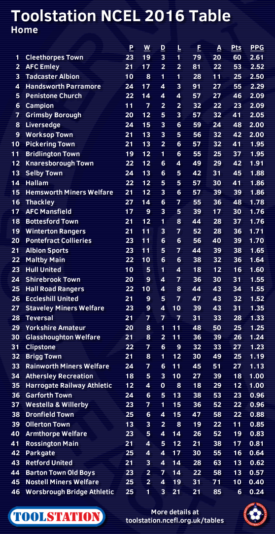 Cleethorpes Town were the best team on their own patch as they averaged 2.61 points per game at home ahead of AFC Emley (2.52) and Tadcaster Albion (2.50).