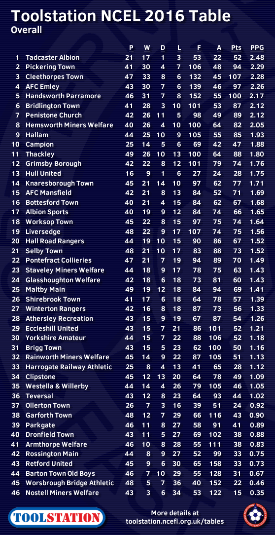 The 2015/16 Toolstation NCEL Premier Division winners Tadcaster Albion have come out top as the team with the best points per game average in the league during 2016.The 52 points they accrued in the 21 games they played in the NCEL in the past calendar year gave them a points per game average of 2.48, ahead of Pickering Town (2.29), Cleethorpes Town (2.28), AFC Emley (2.26) and Handsworth Parramore (2.17).