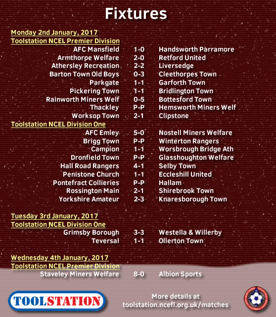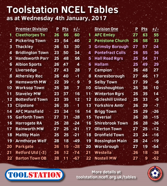 The lead at the top of the Toolstation NCEL Premier Division and Division One tables for Cleethorpes Town and AFC Emley, respectively, has grown after they both won their opening games of 2017 this week.Cleethorpes beat bottom-placed hosts