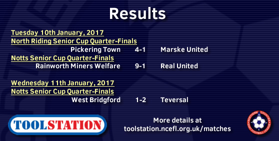 All three of the Toolstation NCEL sides who were in County Cup action in midweek claimed excellent wins to book their place in the last four of their respective competitions.Pickering Town were 4-1 victors at home to Ebac Northern League opponents Marske United in the North Riding Senior Cup, taking an early lead through an own goal and Nicholas Thompson doubling their advantage before half-time.
