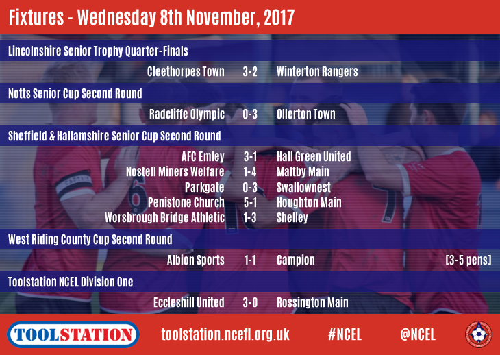 And, in the Second Round of the Notts Senior Cup, Ollerton Town triumphed 3-0 at Radcliffe Olympic, Christopher Hewitt striking twice with a Lewis Bingham goal in between to ensure the Division One side remained in the competition.