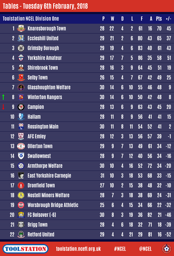 | R | 22 | Retford United | 42 | 24 | -73 |