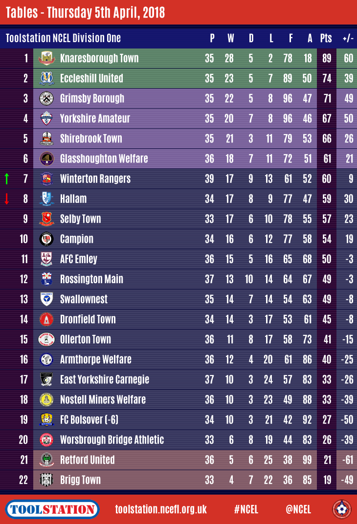 | R | 22 | Retford United | 42 | 24 | -73 |