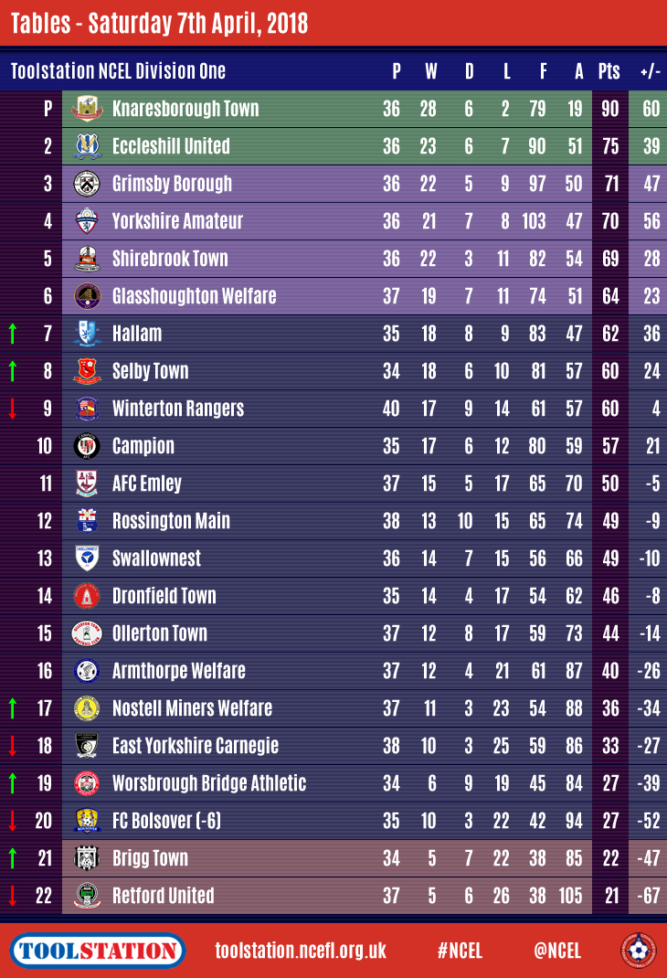 Yorkshire Amateur and Shirebrook Town, meanwhile, will be hopeful of a late say in the fight for the top two as away wins moved them to within five and six points of Eccleshill, respectively.