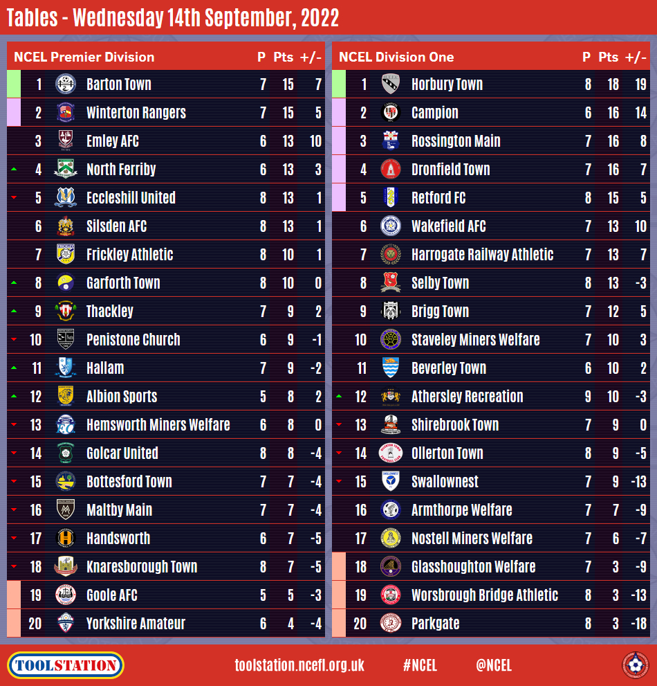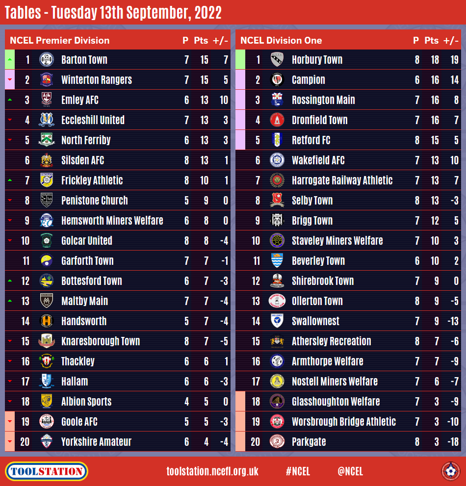 Barton Town have moved to the top of the Premier Division after Toolstation NCEL football returned in midweek from its pause at the weekend.A minute's silence was observed prior to all games and black armbands were worn in honour of Her Late Majesty Queen Elizabeth II as the league paid its respects.