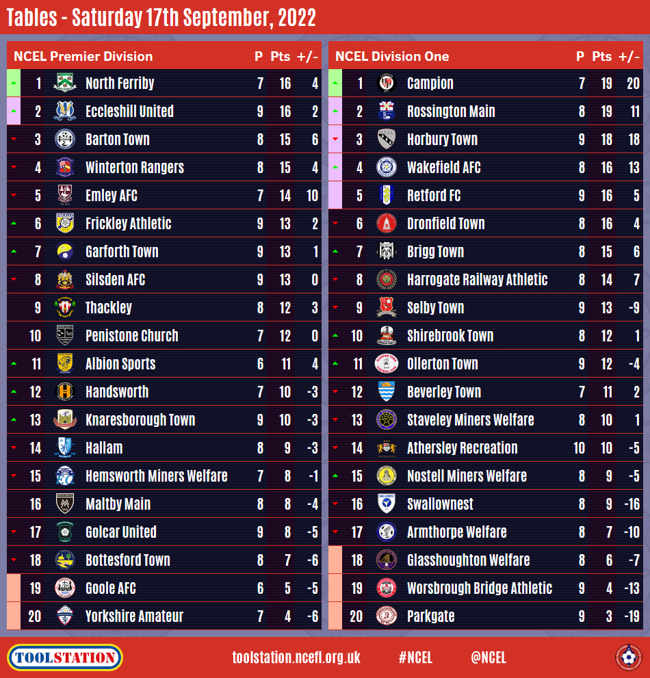 North Ferriby and Campion are the leaders of the Toolstation NCEL Premier Division and Division One, respectively, after victories propelled them both to the summit.It was the first time this season that all forty NCEL clubs were involved in action on Saturday afternoon and it proved to be a day of high drama and plenty of goals.