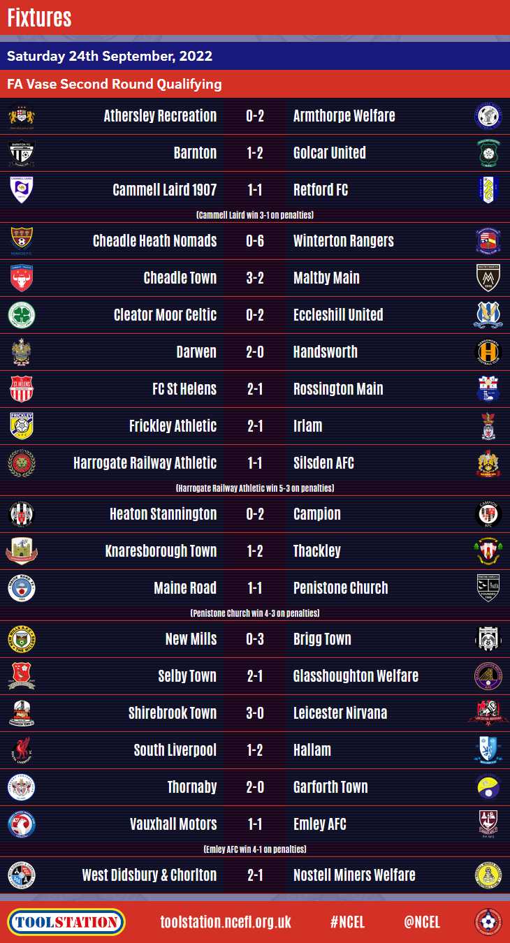 Fifteen Toolstation NCEL sides booked their places in the First Round Proper of this season's Isuzu FA Vase with Second Round Qualifying victories over the weekend.Ollerton Town were the first as they overcame fellow Step 6 side Blidworth Welfare in their short trip to their Nottinghamshire neighbours on Friday evening.