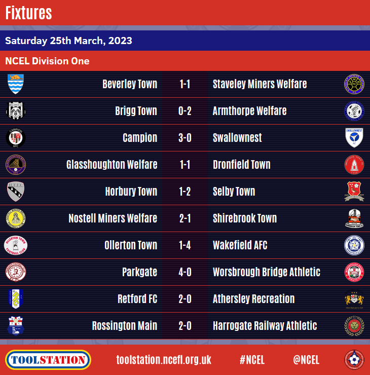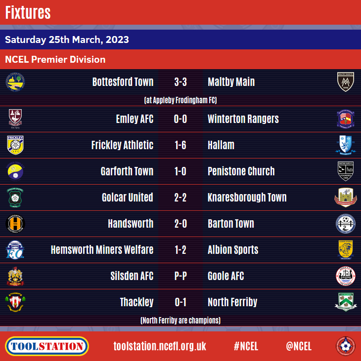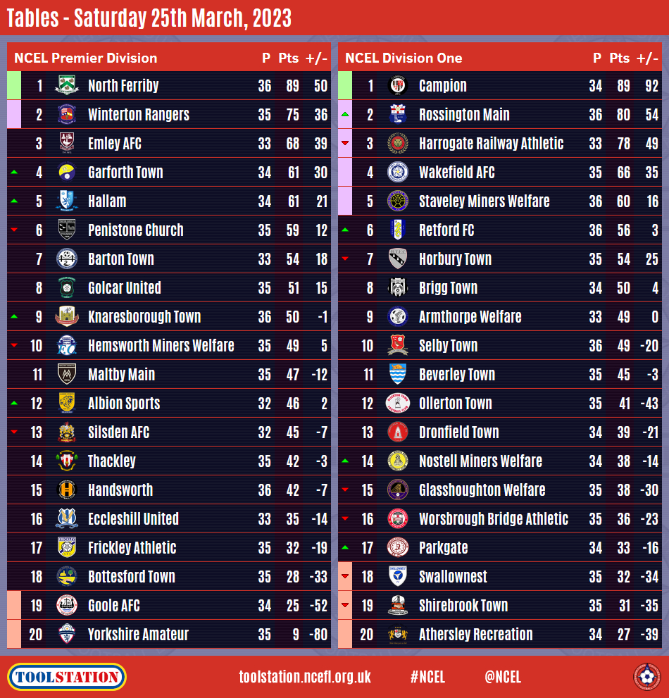 Congratulations to North Ferriby who secured the Toolstation NCEL Premier Division title with a 1-0 victory at Thackley on Saturday.The Villagers knew that a point would be enough to be crowned champions with two games to spare and they edged a tight contest at Dennyfield, Joshua Dennett grabbing the matchwinner just before half-time.