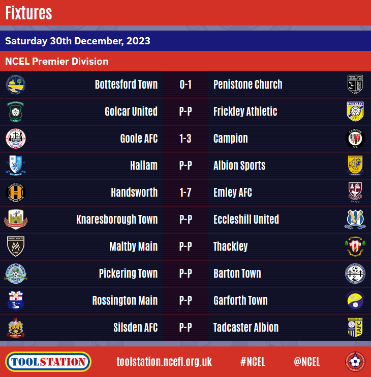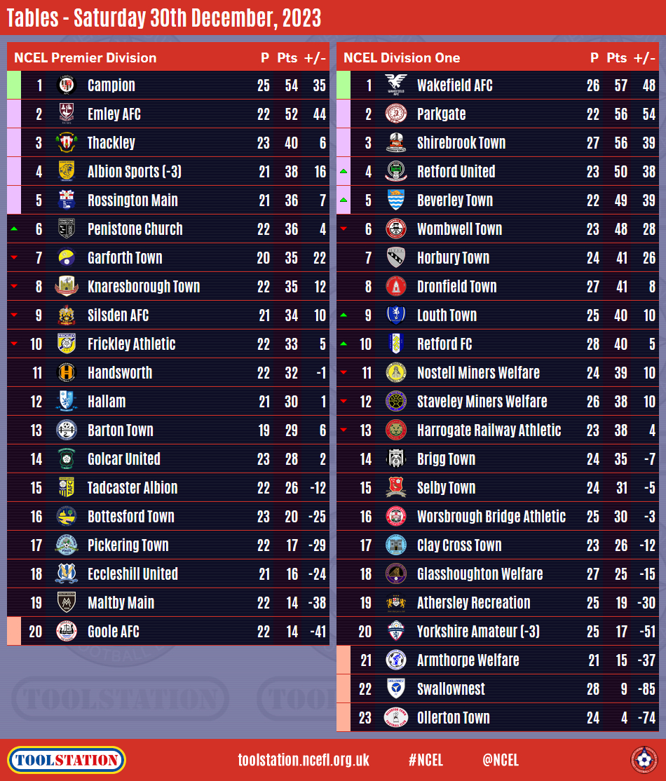 The Toolstation NCEL Premier Division's top two, Campion and Emley AFC, moved further away from the chasing pack as they secured away victories on Saturday in the final round of matches in 2023.Campion remain two points clear of the Pewits at the summit following their 3-1 win at bottom side