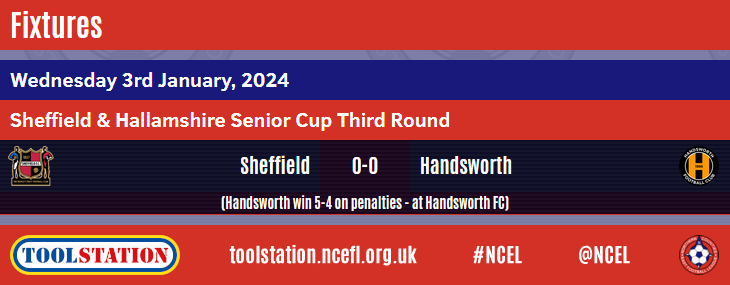 In midweek, Handsworth caused an upset in the Third Round of the Sheffield & Hallamshire Senior Cup as they drew 0-0 with Sheffield before progressing at the expense of their Pitching In Northern Premier League opponents, winning 5-4 in the shoot-out.
