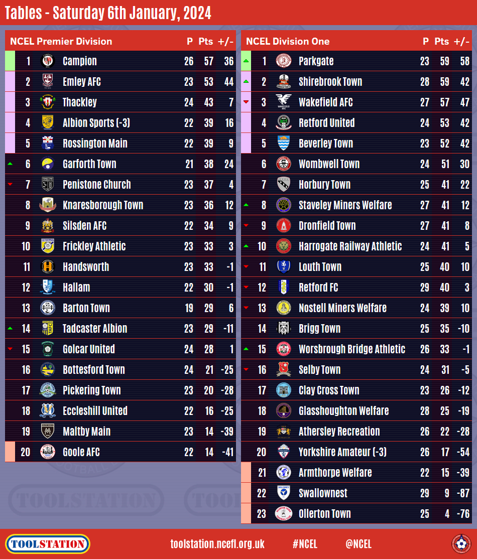 Campion's lead at the top of the Toolstation NCEL Premier Division has grown whilst Parkgate are the new Division One leaders after the opening weekend of games in 2024 took place on Saturday afternoon.The Red & Blacks are now four points clear after they came from behind to win 2-1 at next-to-bottom