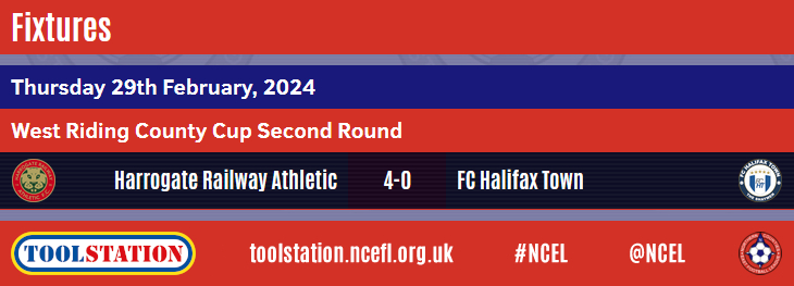 Harrogate Railway Athletic produced a shock as they were comfortable winners in their Second Round tie, Harry Bandeira, Nathan Merchant twice, and Joseph Navier all scoring in the first half to win 4-0 at home to FC Halifax Town.