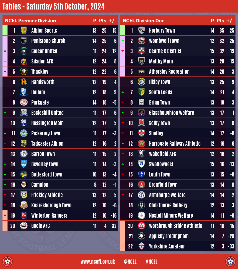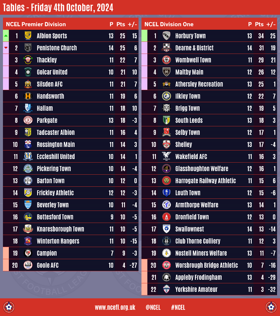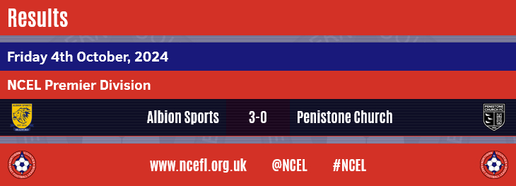 Albion Sports won Friday night's top-of-the-table NCEL Premier Division clash to climb to the summit, overtaking Penistone Church by beating them 3-0 at the Horsfall Community Stadium.It was the Lions' fifth straight victory whilst Church have lost their last three with Nathan Cartman giving the home side a nineteenth minute lead before Lewis Waddington added a second late on and Cartman doubled his tally in stoppage time.