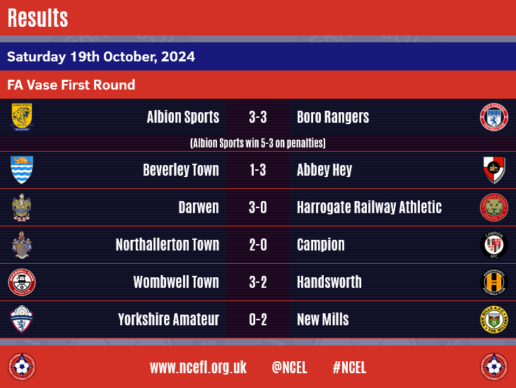 Albion Sports and Wombwell Town booked their places in the Second Round of this season's Isuzu FA Vase with victories on a busy weekend of football involving NCEL sides.Nathan Cartman struck a hat-trick for Sports, equalising on each occasion, as his side refused to capitulate to their visitors Boro Rangers in a pulsating tie that ended 3-3.