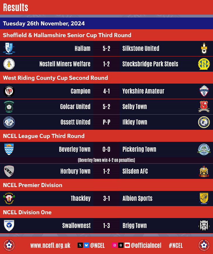 Beverley Town, Penistone Church and Silsden AFC are the latest sides to make it through to the Quarter-Finals of this season's JCP Construction League Cup after Third Round victories in midweek.All three games were tight affairs with Beverley playing out a goalless draw at home with