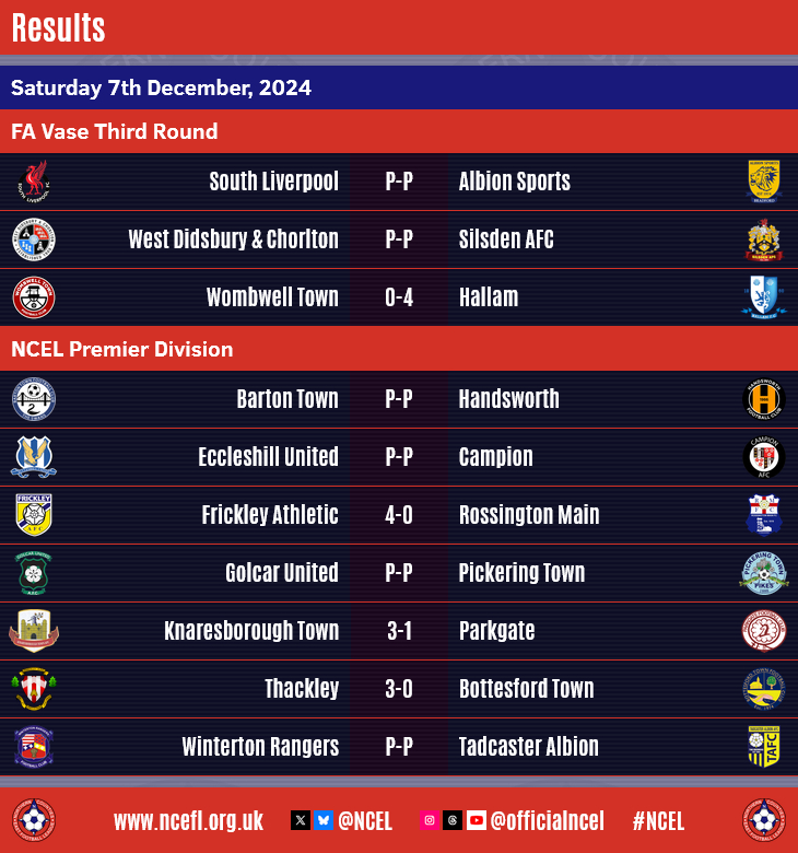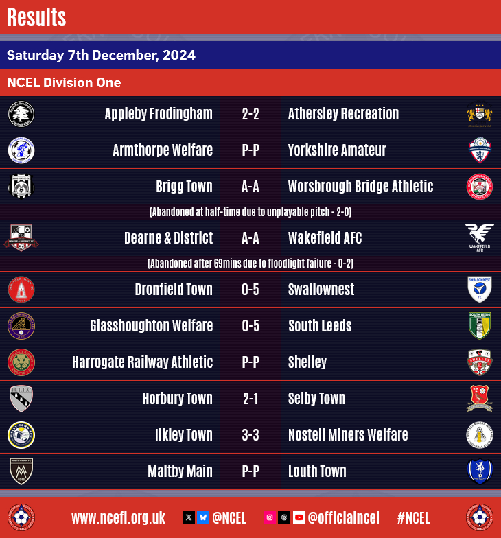 Silsden AFC's match at West Didsbury & Chorlton, were called off, whilst the NCEL saw seven games fall foul of the weather and a further two were abandoned.