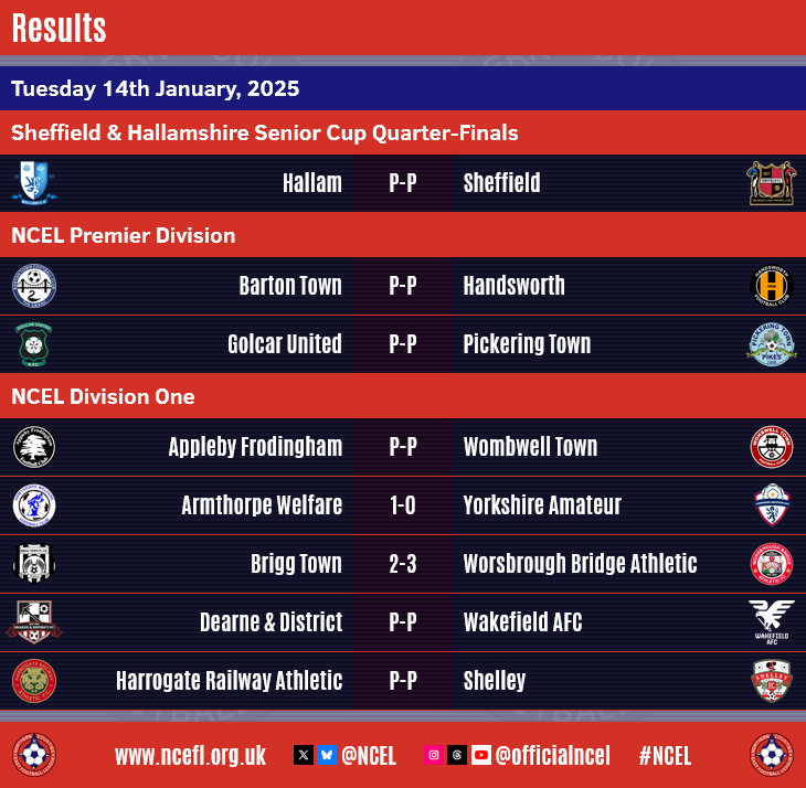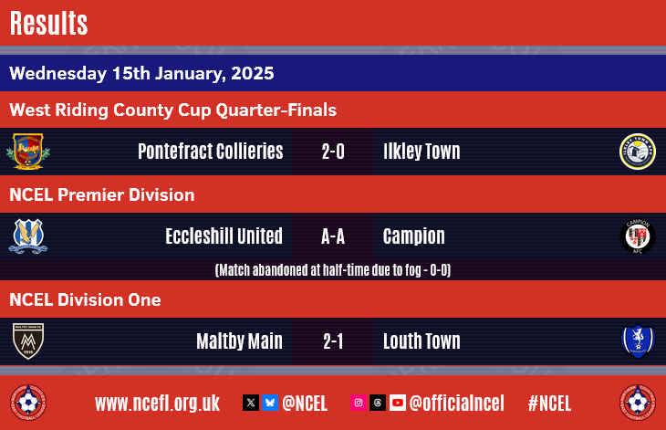 The stop-start beginning to 2025 continued in midweek with six postponements and one abandonment due to the bad weather, leaving just four matches played to a conclusion as many NCEL clubs continued to endure an unplanned winter break.Ilkley Town were involved in West Riding County Cup action as the Division One side travelled to Pitching In Northern Premier League hosts Pontefract Collieries in their Quarter-Final tie.