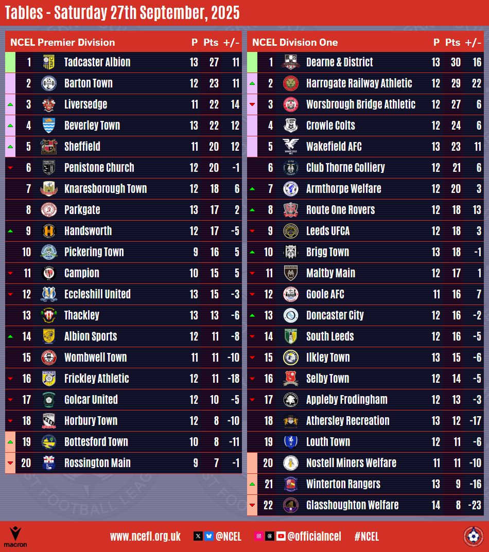 Tadcaster Albion's lead at the summit in the Macron NCEL Premier Division has returned back down to four points after their 3-0 loss at Liversedge on Saturday.On an afternoon that saw a full programme in the league for the first time this season, Antony Brown's first half strike was added to by Alfie Dean and Alexander Wollerton in the final quarter-of-an-hour to claim a win that lifts Sedge into third, five points behind the Brewers.