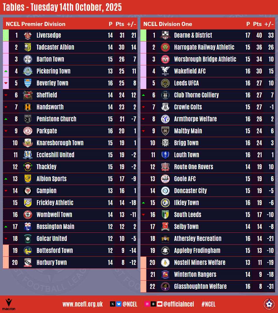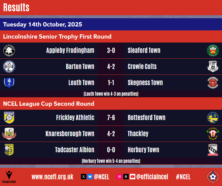 A high-scoring midweek of Macron NCEL action included a 7-6 victory for Frickley Athletic over Bottesford Town whilst Zak Khan scored six in a 9-1 home victory for Route One Rovers, taking his season's tally to 30 in all competitions.Frickley's remarkable win came in the Second Round of the JCP Construction NCEL Cup in memory of James Hitchcock, one of three ties to take place on Tuesday night.