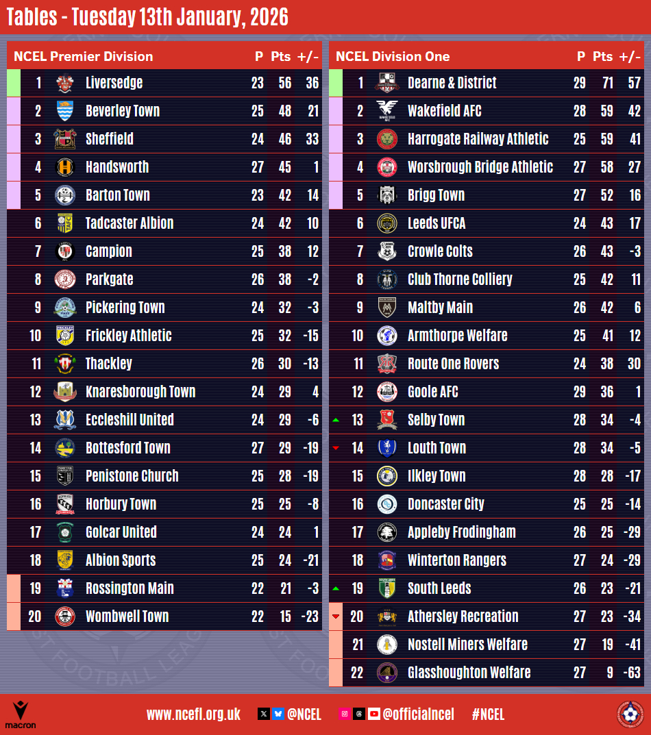 Leeds move out of the relegation zone whilst Armthorpe, Selby and Winterton are tenth, thirteenth and eighteenth, respectively.