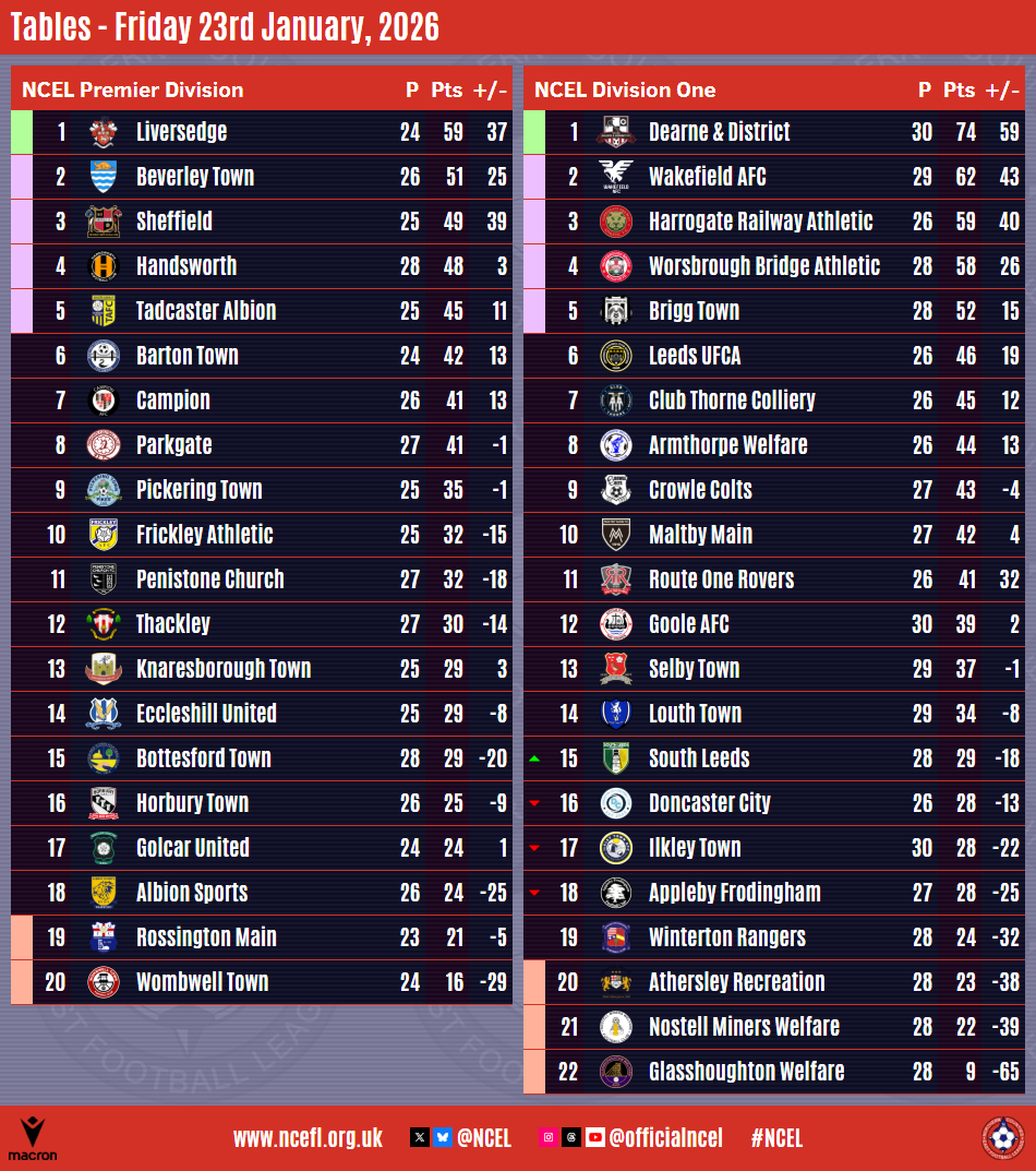 Liversedge saw their advantage at the top of the Premier Division cut whilst Division One leaders Dearne & District took another step towards lifting the title in the weekend's Macron NCEL action.A 1-0 defeat at
