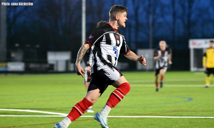 Photo: Scott Hutchinson celebrates grabbing an injury-time equaliser for Brigg Town in their 2-2 home draw with Leeds UFCA as fifth faced sixth in Macron NCEL Division One on Saturday. (Picture: Anna Bäckström)