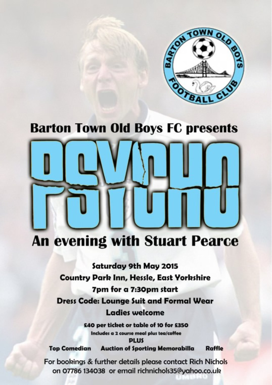 Barton Town Old Boys have announced a Sportsman?s Dinner starring former England legend Stuart Pearce on Saturday 9th May, 2015.The event which is being hosted at the Country Park Inn, Hessle, will feature Pearce alongside top comedian and leading comp?re Jerry Earl.