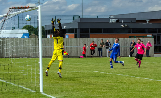 Ollie Hamilton's shot for Grimsby Borough beats the Boston Town keeper but hits the crossbar. (Photo: Paul Nutter)