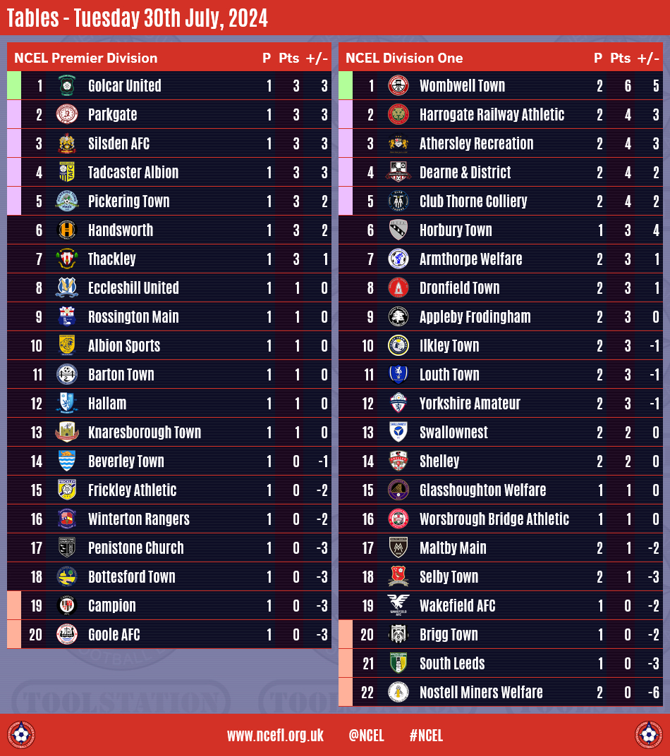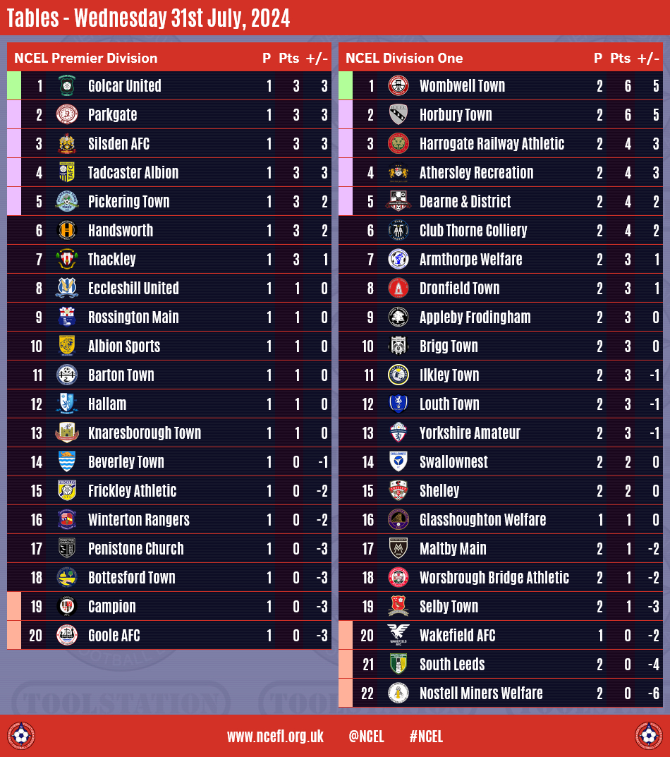 Wombwell Town and Horbury Town are the only two sides to have won their opening two games in the 2024/25 Division One season following the second round of matches in midweek.A Gavin Allott hat-trick helped Wombwell to a 4-1 home victory over