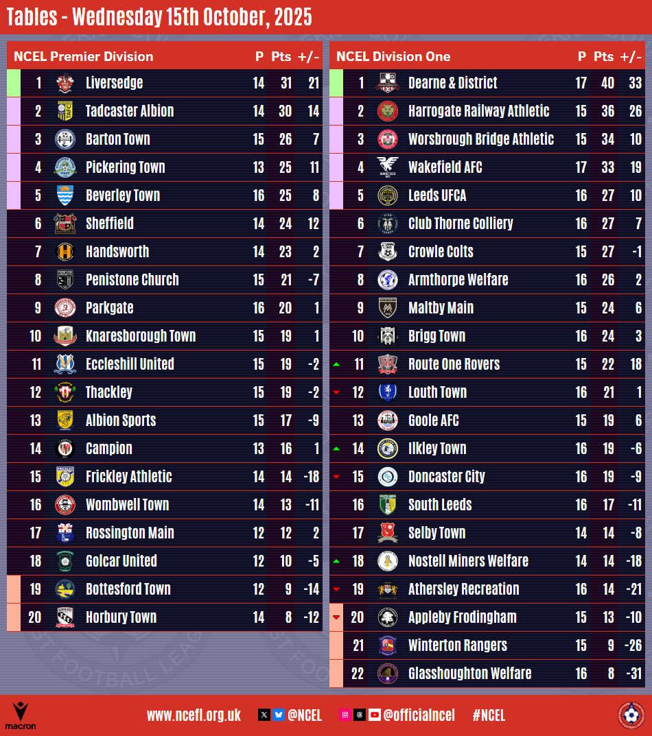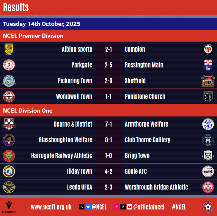 A high-scoring midweek of Macron NCEL action included a 7-6 victory for Frickley Athletic over Bottesford Town whilst Zak Khan scored six in a 9-1 home victory for Route One Rovers, taking his season's tally to 30 in all competitions.Frickley's remarkable win came in the Second Round of the JCP Construction NCEL Cup in memory of James Hitchcock, one of three ties to take place on Tuesday night.