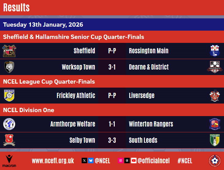 Leeds move out of the relegation zone whilst Armthorpe, Selby and Winterton are tenth, thirteenth and eighteenth, respectively.