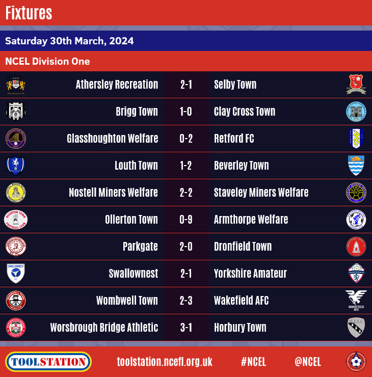 Ollerton Town with a hat-trick for Adam Baskerville, a Luis Alfonso-Ferreira brace, and one each for Jack Varley, Matthew Flanagan, Jordan Buckham and Charlie Clegg.