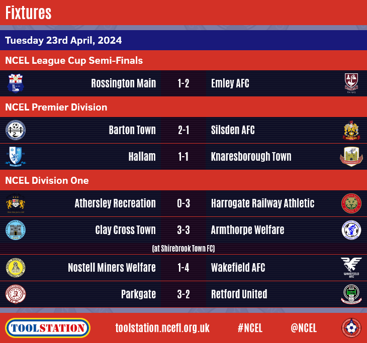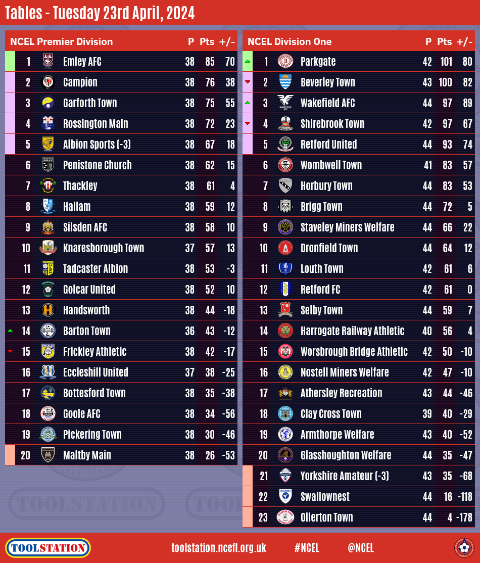 Congratulations to Parkgate who won both of their midweek matches to become champions in what has been a remarkable chase for the Toolstation NCEL Division One title.The first of their two victories came on Tuesday night when a Ross Duggan double, added to by Jack Haslam, helped them to a 3-2 defeat of visitors