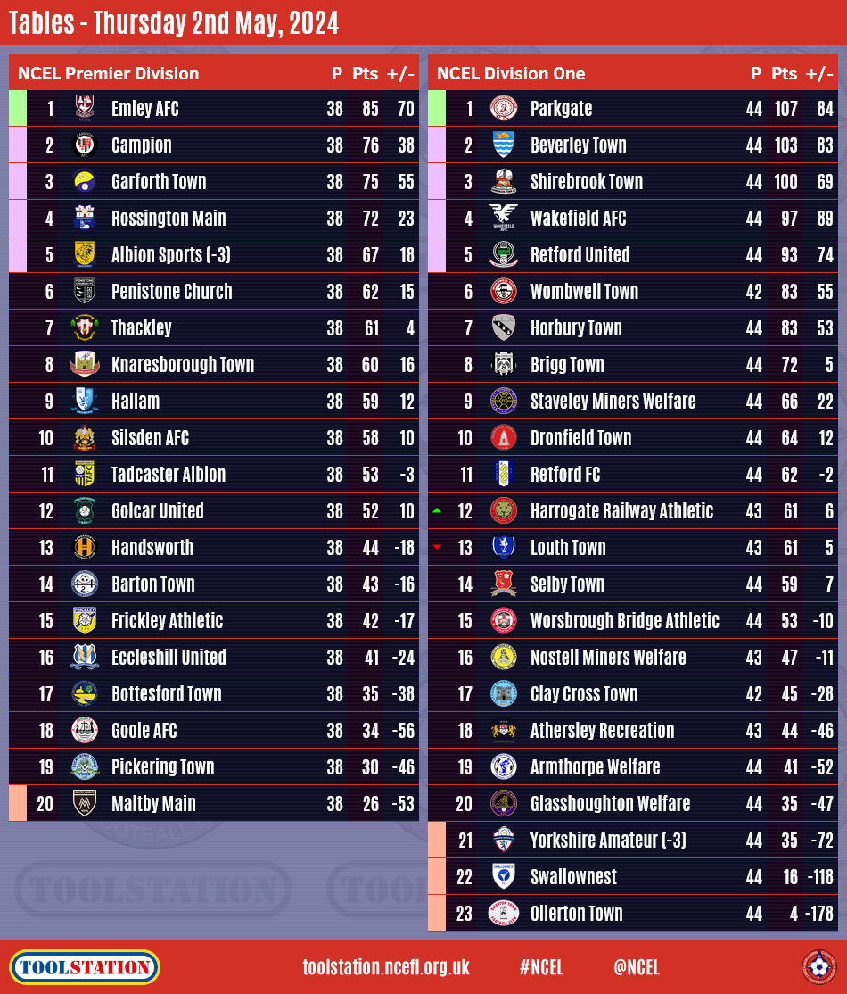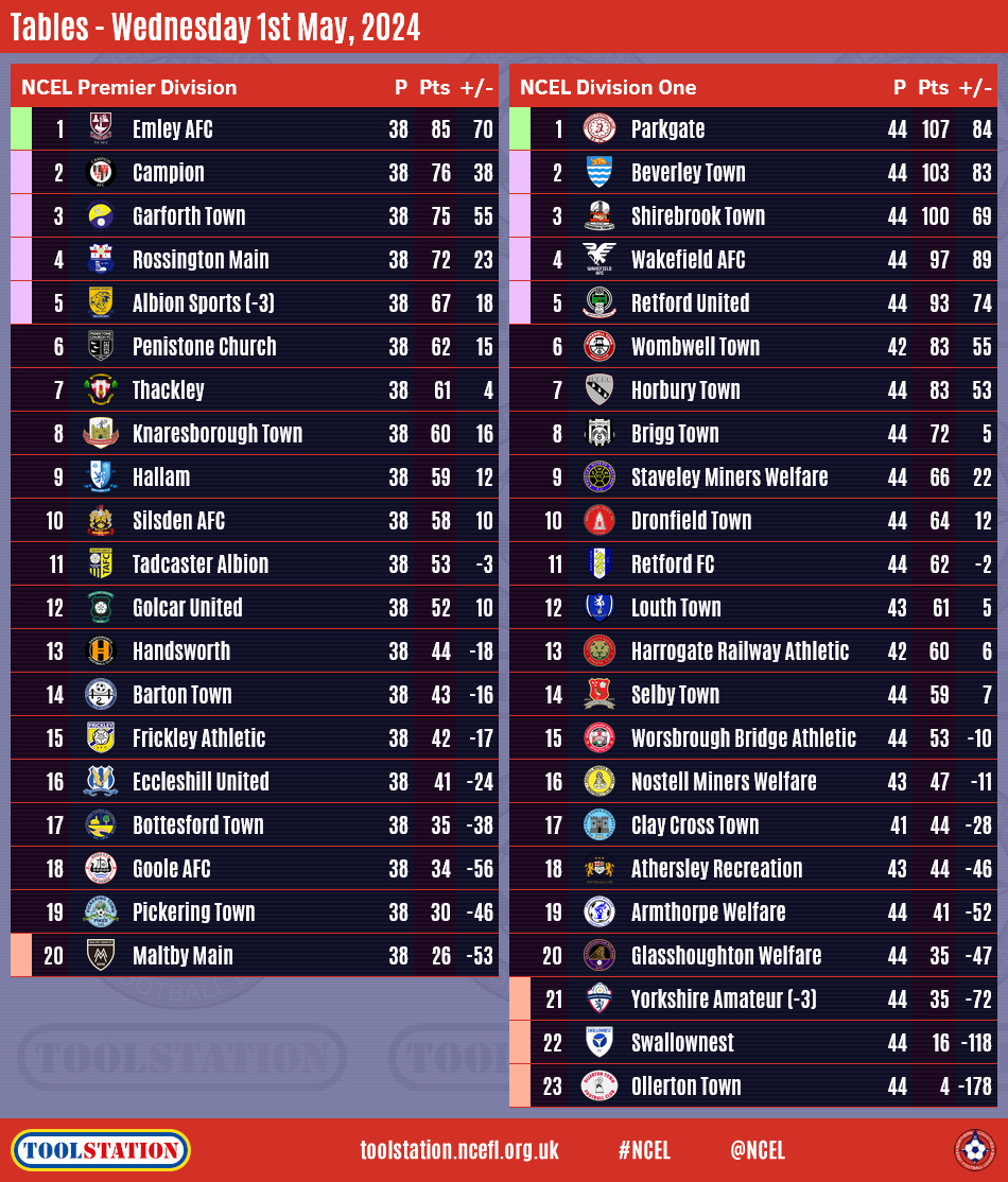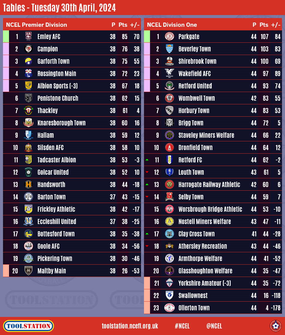 P | 1 | Emley AFC | 38 | 85 | 70 |