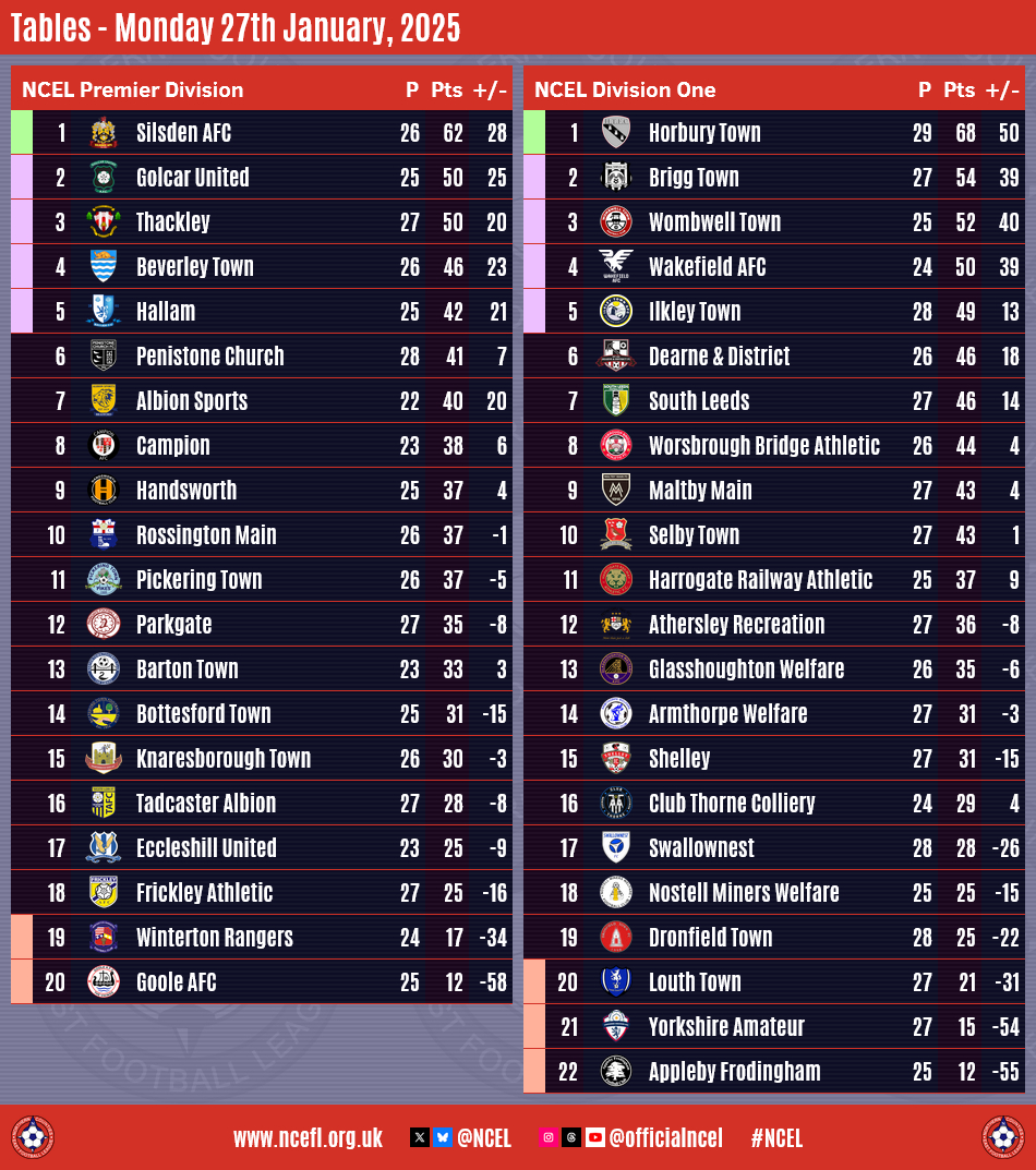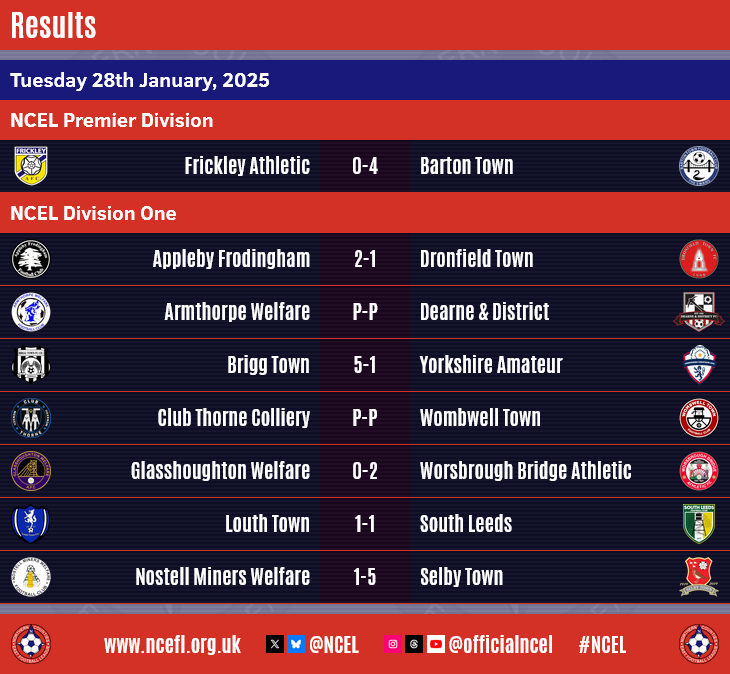 And, there were two Division One games postponed due to waterlogged pitches with Club Thorne Colliery's home game with
