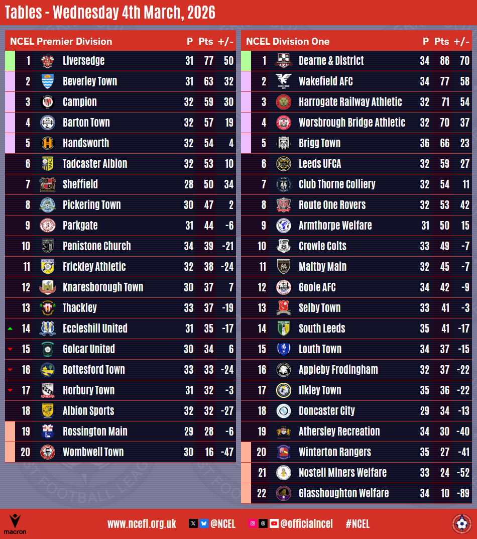 Wombwell are now sixteen points adrift with eight games remaining whilst Sports have opened up a four-point gap between themselves and the other side in the relegation zone,