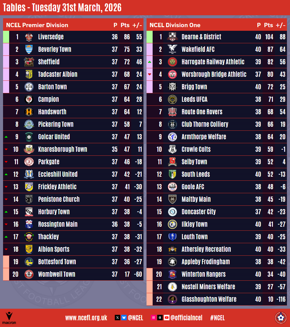 Five sides will go into their final round of matches on Saturday looking to avoid ending the Macron NCEL campaign in the Premier Division relegation zone after midweek games eased concerns for some or made the upcoming weekend even more nervous for others.Eccleshill United are safe after a 1-0 win at basement side